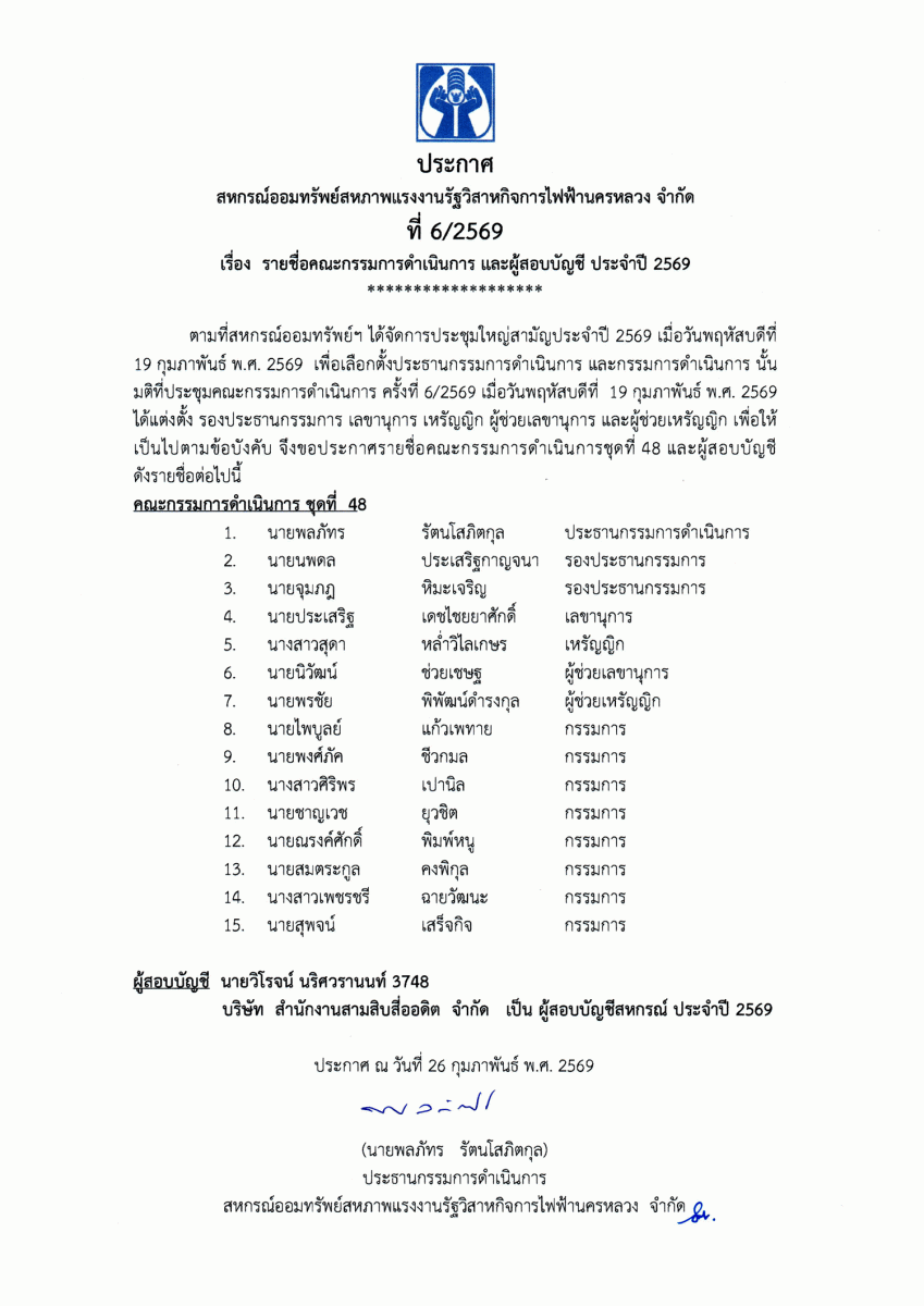 ประกาศที่ 6/2569 เรื่อง รายชื่อคณะกรรมการดำเนินการ และผู้สอบบัญชี ประจำปี 2569