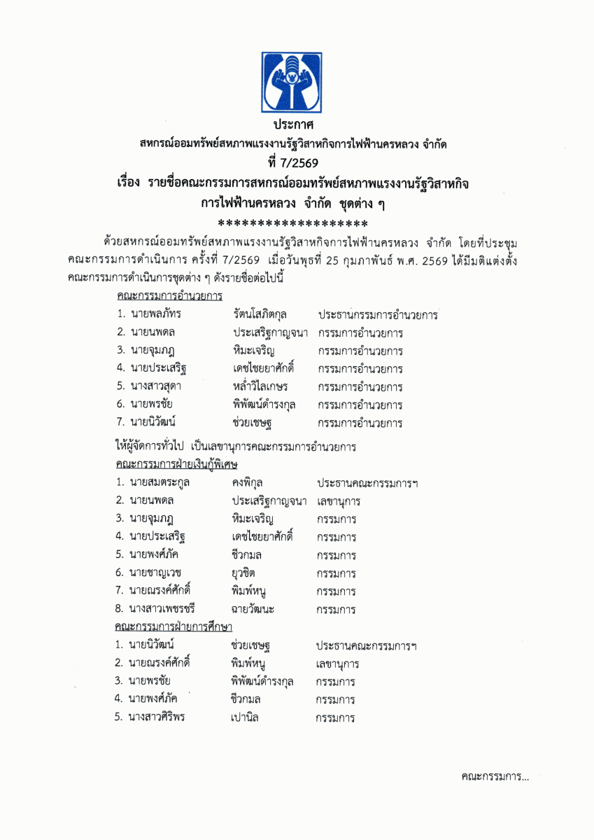 ประกาศที่ 7/2569 เรื่อง รายชื่อคณะกรรมการสหกรณ์ออมทรัพย์ฯ ชุดต่าง ๆ