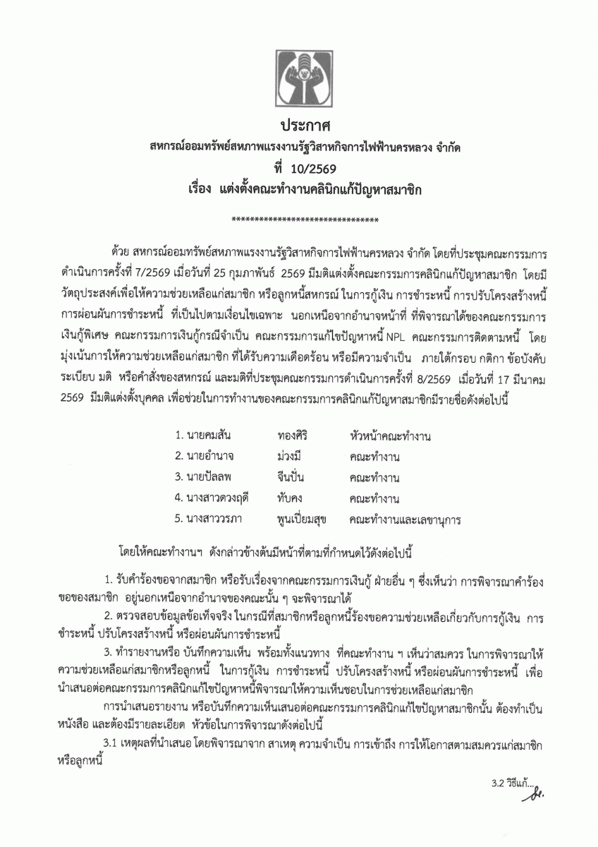 ประกาศที่ 10/2569 เรื่อง แต่งตั้งคณะทำงานคลินิกแก้ปัญหาสมาชิก