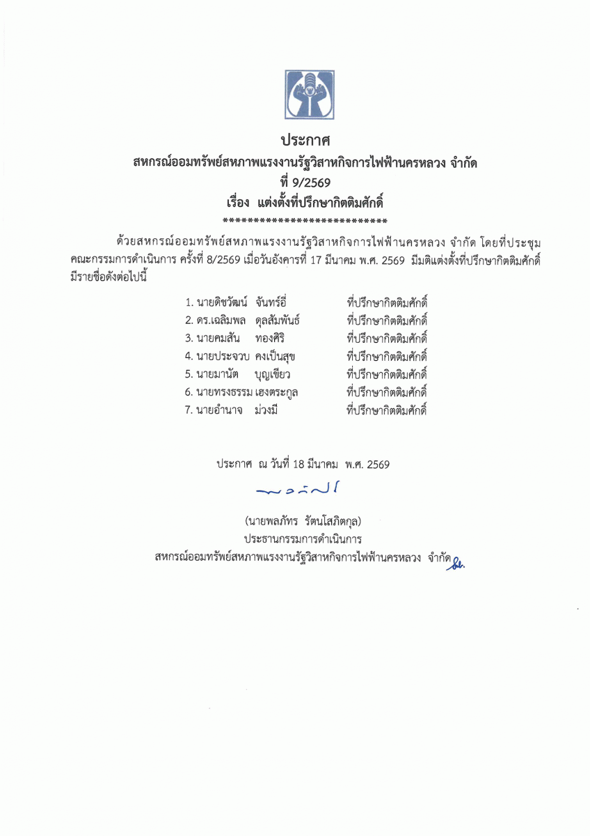 ประกาศที่ 9/2569 เรื่อง แต่งตั้งที่ปรึกษากิตติมศักดิ์