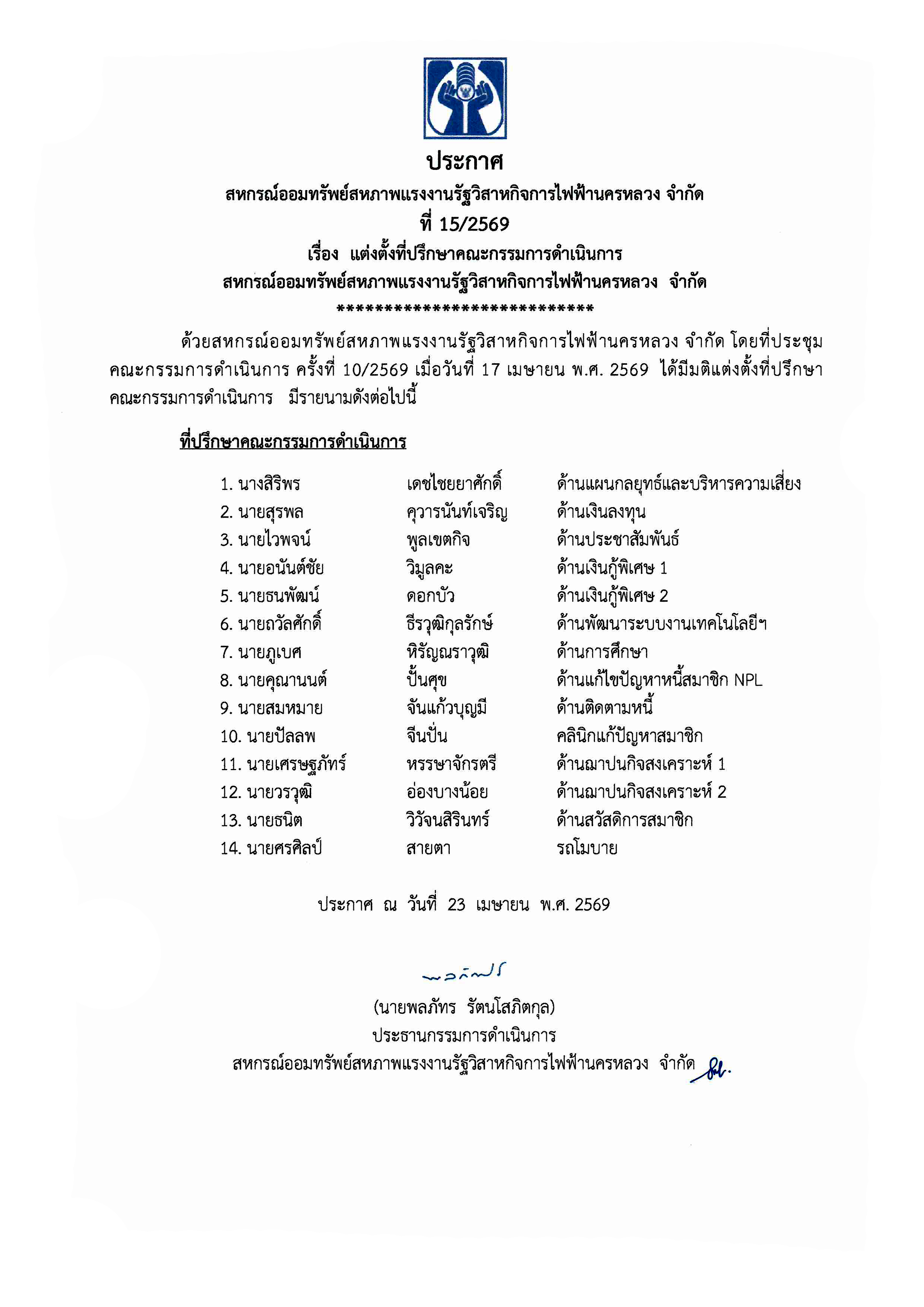 ประกาศที่ 15/2569 เรื่อง แต่งตั้งที่ปรึกษาคณะกรรมการดำเนินการสหกรณ์ออมทรัพย์ฯ