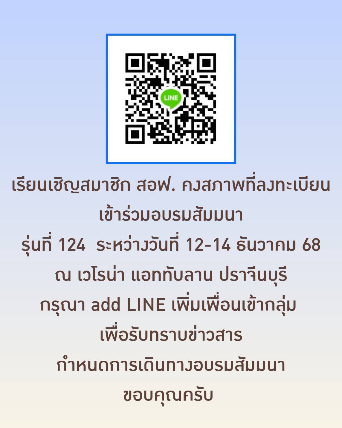 ประกาศรายชื่อผู้มีสิทธิเข้าร่วมสัมมนา รุ่น 124 ระหว่างวันที่ 12 - 14 ธันวาคม 2568 ณ โรงแรมเดอะเวโรน่า แอท ทับลาน จ.ปราจีนบุรี