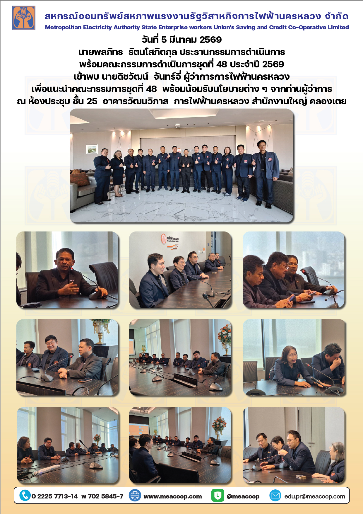วันที่ 5 มีนาคม 2569 นายพลภัทร รัตนโสภิตกุล ประธานกรรมการดำเนินการ พร้อมคณะกรรมการดำเนินการชุดที่ 48 ประจำปี 2569 เข้าพบ ผู้ว่าการการไฟฟ้านครหลวง