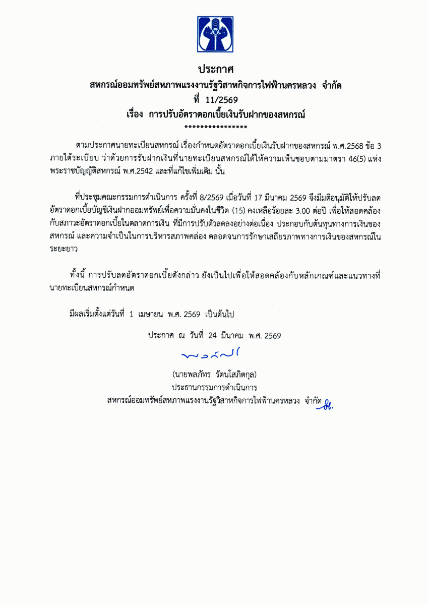 ประกาศที่ 11/2569 เรื่อง การปรับอัตราดอกเบี้ยเงินรับฝากของสหกรณ์