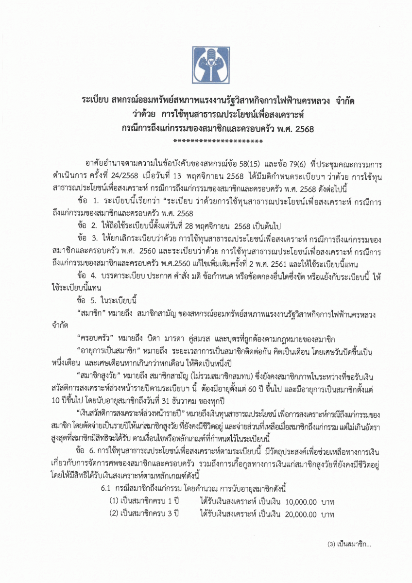 ระเบียบสหรณ์ ฯ ว่าด้วย การใช้ทุนสาธารณประโยชน์เพื่อสงเคราะห์กรณีการถึงแก่กรรม