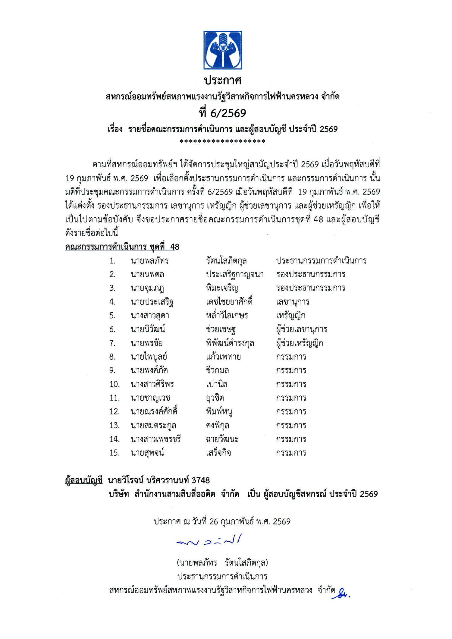 ประกาศที่ 6/2569 เรื่อง รายชื่อคณะกรรมการดำเนินการ และผู้สอบบัญชี ประจำปี 2569