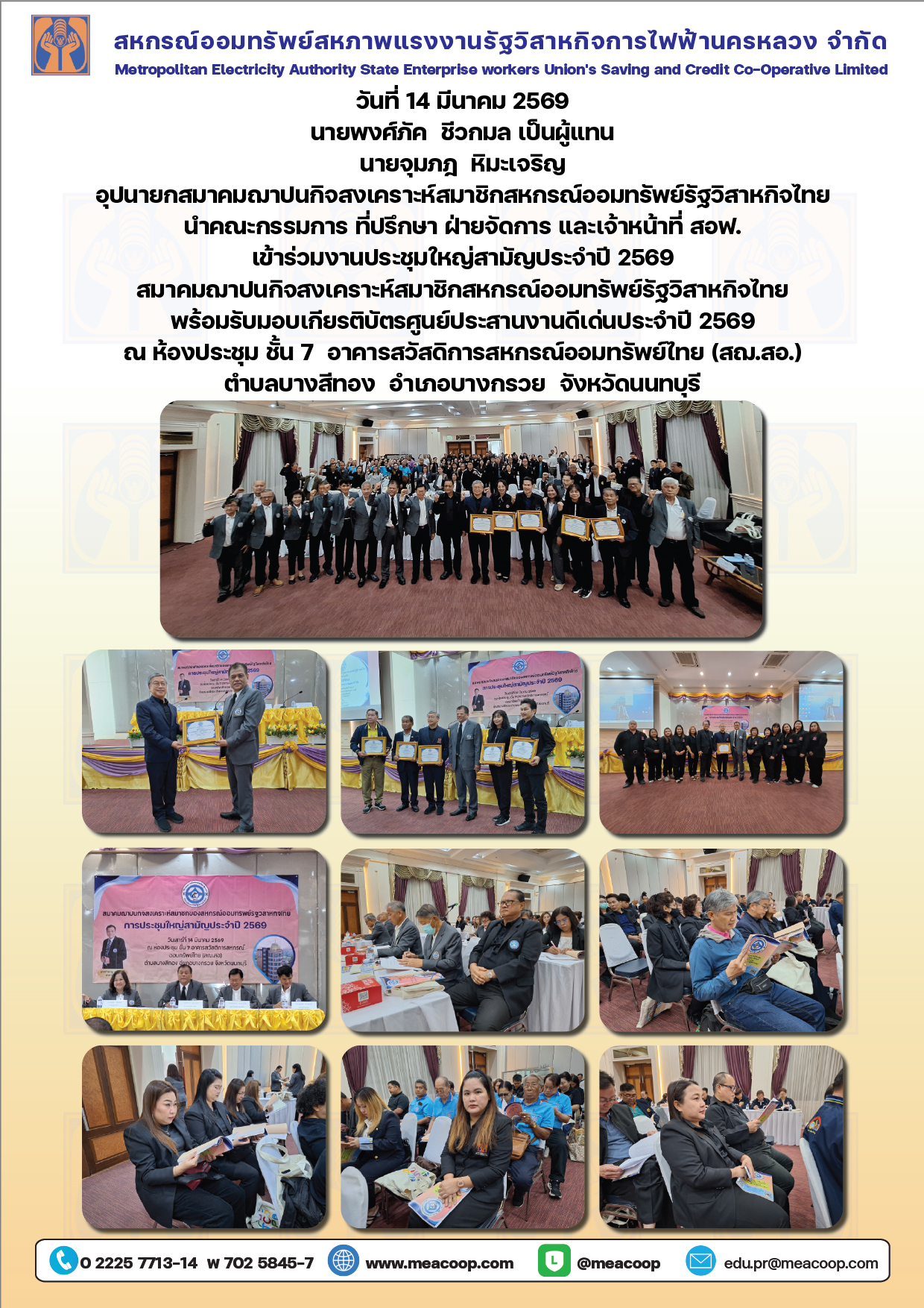 14 มีนาคม 2569 คณะกรรมการ ที่ปรึกษา ฝ่ายจัดการ และเจ้าหน้าที่ สอฟ. เข้าร่วมงานประชุมใหญ่สามัญ ประจำปี 2569 สมาคมฌาปนกิจสงเคราะห์สมาชิกสหกรณ์ออมทรัพย์รัฐวิสาหิจไทย
