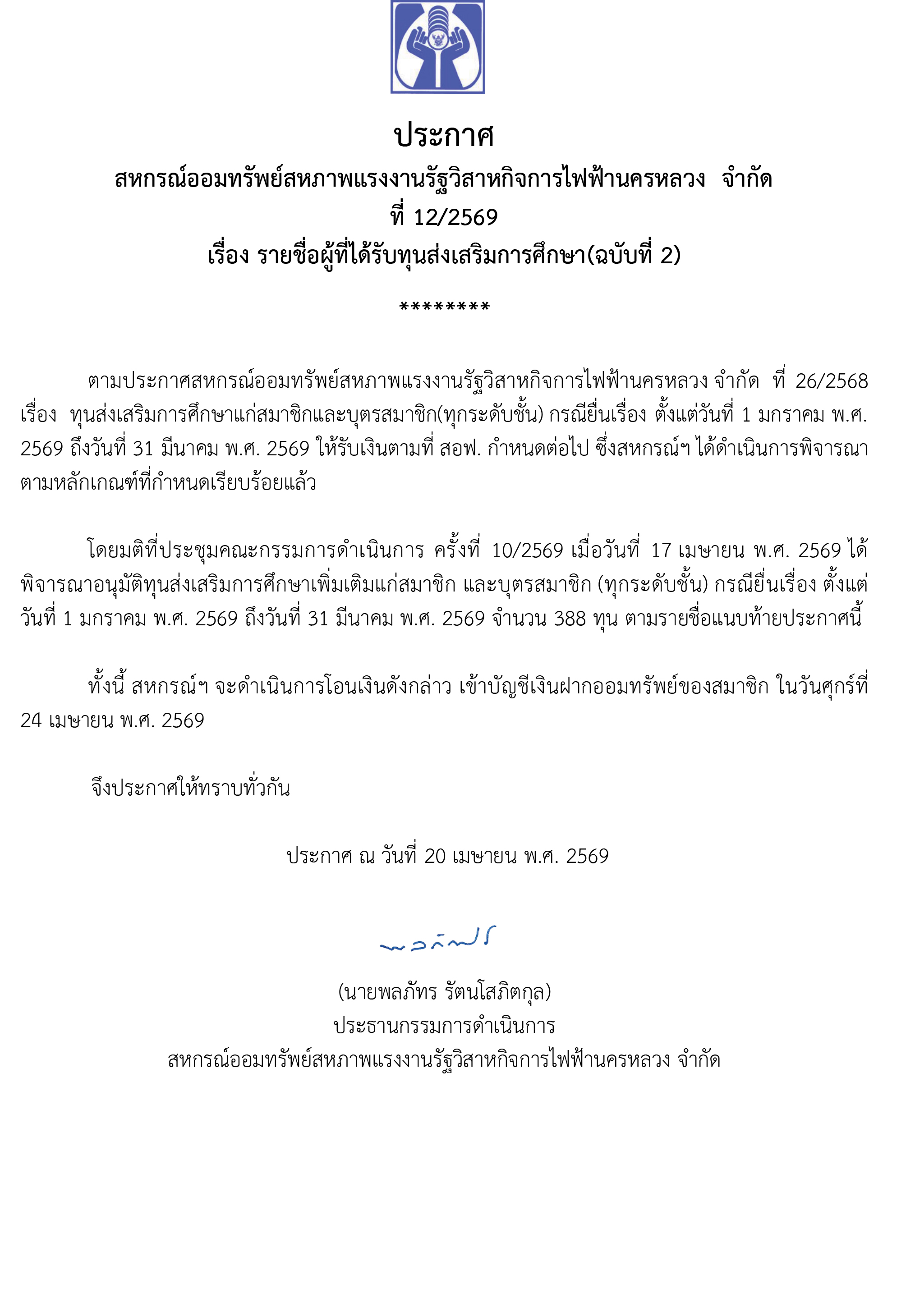 ประกาศที่ 12/2569 เรื่อง รายชื่อผู้ที่ได้รับทุนส่งเสริมการศึกษา(ฉบับที่ 2)