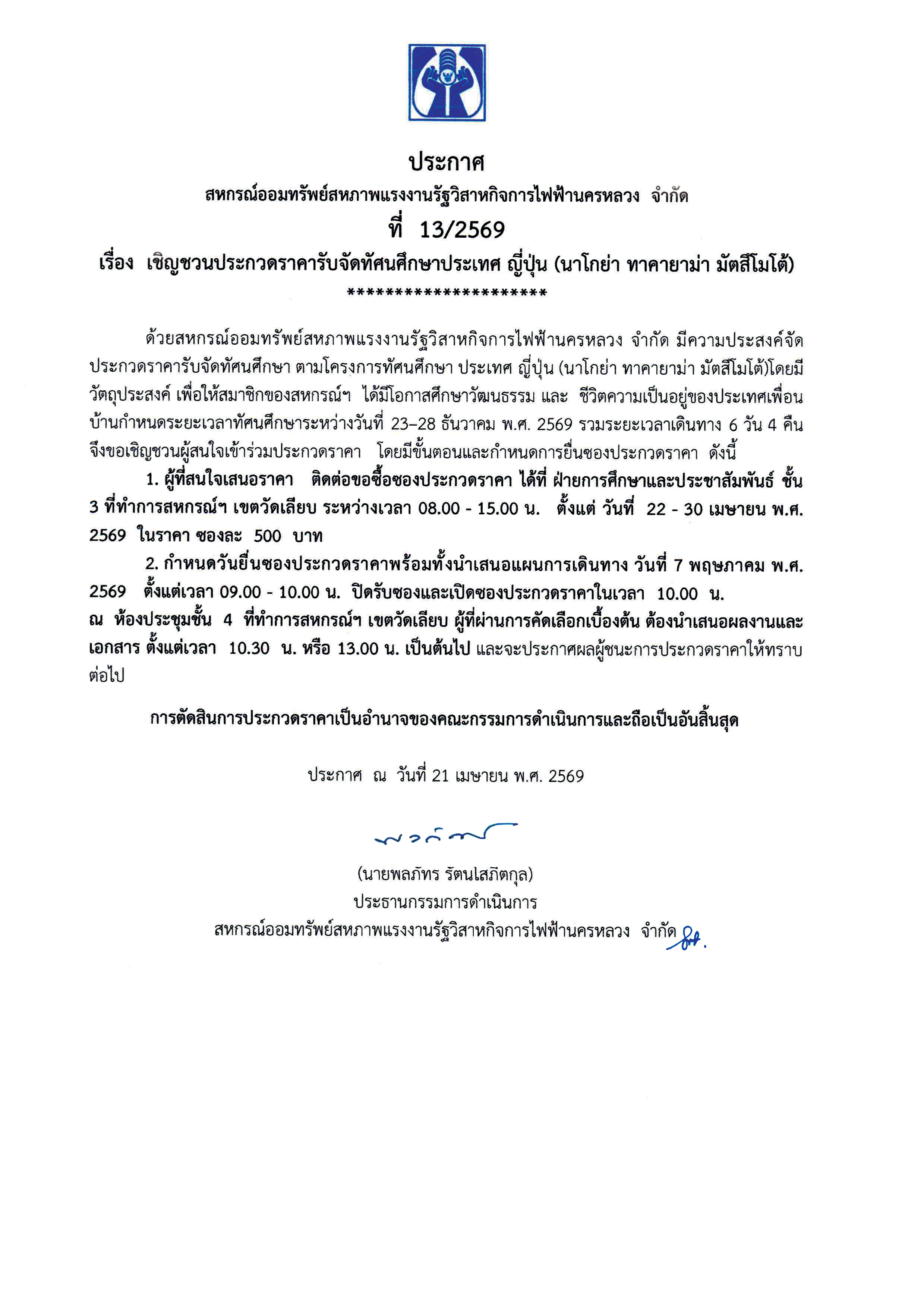 ประกาศที่ 13/2569 เรื่อง เชิญชวนประกวดราคารับจัดทัศนศึกษาประเทศ ญี่ปุ่น (นาโกย่า ทาคายาม่า มัตสึโมโต้)